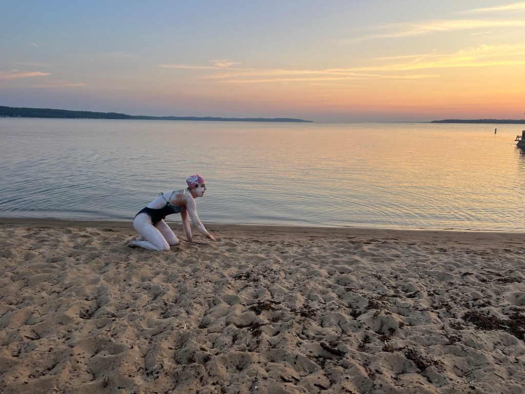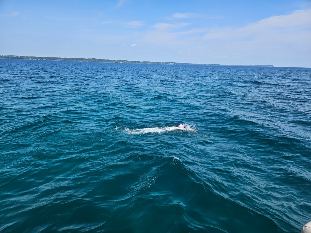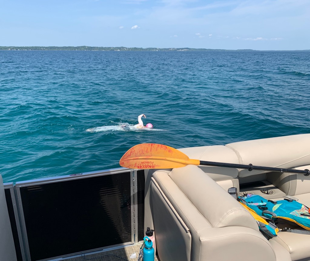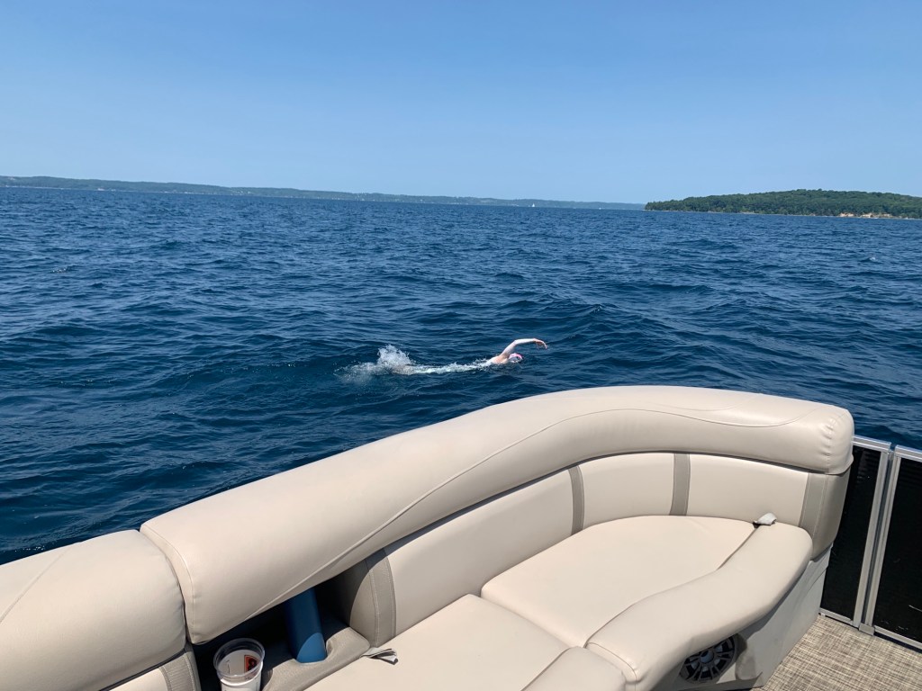 Before I knew it, the year had passed and I was standing on the beach at Clinch Park, on West Grand Traverse Bay, butterflies in my stomach and hands shaking as I strode into the water, lowering my hand to signal to the crew the start of my swim.