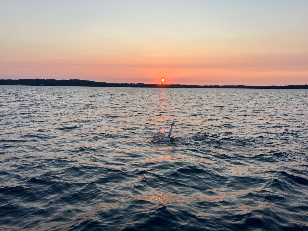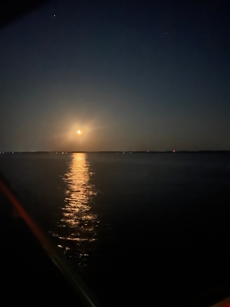 At one point, I took off my goggles and stared at the Milky Way, marveling at it with Michelle and Lisa. There’s nothing like star gazing in the middle of a large body of water. The moon rose around midnight and was a sight to see, glowing orange as it peaked over the horizon. The wind quit and the water was calm and peaceful for a few hours.