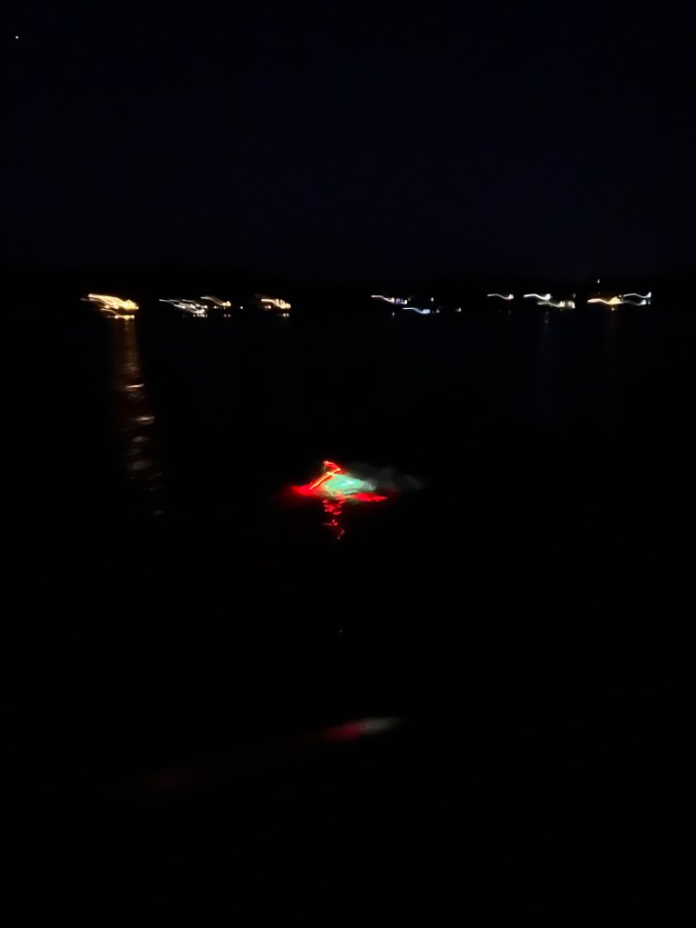 I obsessed about the time, my pace and the size of the lights of Traverse City ahead. Were they getting any closer? I asked during a feed, somewhat demoralized. Lisa and Michelle assured me I was doing great and they buoyed my spirits. A few minutes later I told them, “you know, I think I’m going to be totally ok”. They were happy to see me more upbeat and gave cheers as I resumed swimming. The sky was lightening and Lisa pointed out the lights of her Jeep shining on shore, “Laura, Sam and Bruce are all there, waiting for us!” she exclaimed. I kept going and going. Finally, I could see the light I’d sewn onto my suit shining on the lake floor below. I composed a haiku: